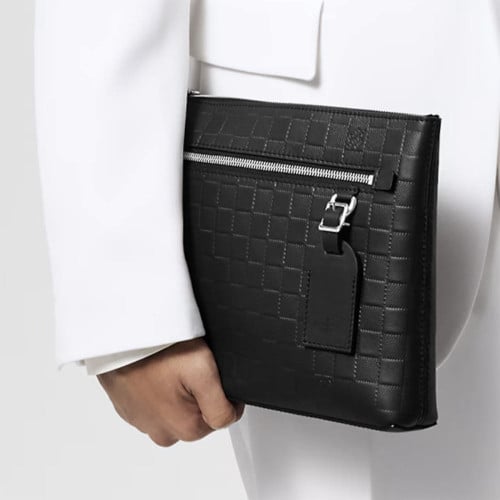 다미에 인피니 가죽 소재의 테이크오프 파우치. 앞면 포켓과 상단에 블랙 색상의 지퍼가 달린 디자인. 아이패드를 수납할 수 있을 만큼 넉넉한 크기. 포멀한 룩에 완벽하게 어울리는 작은 백. 현대적이고 고급스러운 분위기를 더해주는 작은 D링에 달린 가죽 네임 택.
