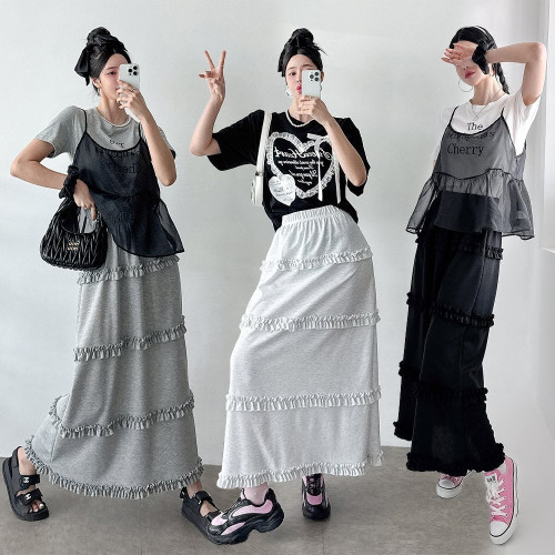 전체적으로 여유 있는 캉캉단층 와이드 핏으로 체형 커버는 물론, 밑단 캉캉 스타일로 여성스러운 분위기가 돋보이고 롱한 기장감으로 전신 체형 커버 GOOD !