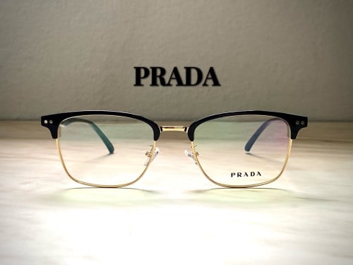 멀리서도 프라다시그니처가 돋보이는 안경입니다 브릿지에 고급스런 골드 장식으로