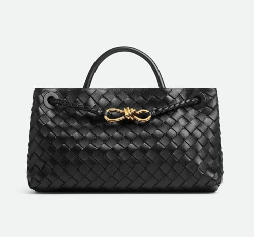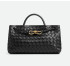 탄력 있는 나파 가죽 소재를 정교한 인트레치아토 위빙으로 완성한 탑 핸들 백으로 긴 실루엣이 특징적이며 슬라이딩 크로스 스트랩과 시그니처 놋 디테일이 있음.
