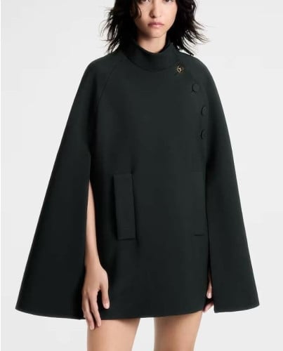 울 실크 캐디 크레이프 소재의 절제된 케이프 코트. 높은 칼라를 구성한 깔끔한 실루엣.