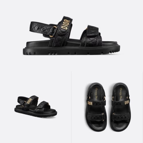 블랙 퀼트 까나쥬 송아지 가죽까나쥬 모티브의 블랙 퀼트 송아지 가죽 소재로 제작된 모던한 실루엣의 Dioract 샌들입니다. 아주 가볍고 편안한 가죽을 사용하여 인체공학적인 실루엣으로 제작한 솔이 특징입니다. 위쪽에 골드 피니시 메탈 Dior 시그니처를 장식한 셀프 여밈 스트랩 2개가 디자인을 완성합니다. 다양한 룩에 매치해 모던한 터치를 더할 수 있는 샌들입니다.
