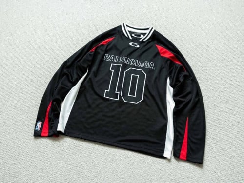 •최상위 버전 Balencia**(발****) × 노**A SS26 콜라보 컬렉션 라운드넥 배색 라인 테크 메쉬 원단 루즈핏 롱슬리브 (남녀 공용) 이 제품은 완벽하게 복각된 아이템으로, 클래식한 저지(농구 유니폼) 실루엣을 재현했습니다. 래글런(빅 숄더) 소매와 배색 스트라이프 디테일로 깔끔한 농구복 느낌을 살렸고, 블랙×레드 컬러 조합은 자연스럽게 빈티지한 분위기를 연출합니다. 전면에는 입체감 있는 “BALENCIA** 10” 자수가 적용되어 있으며, 소매 안쪽에는 노**A 로고가 은근하게 자리해 고급스러운 포인트를 더합니다. 실착용성이 높고 여유 있는 루즈핏이라 레이어드에 적합하며 단독 착용 시에도 스트릿한 아우라를 충분히 살려줍니다. 데일리·외출용으로 폭넓게 활용 가능한 강력 추천 아이템입니다.